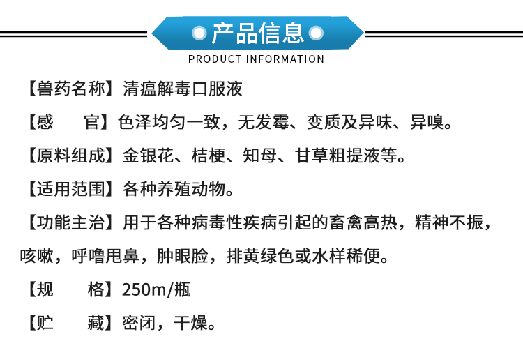 【功能主治】用于各種病毒性疾病引起的畜禽高熱,精神不振,咳嗽,呼嚕甩鼻,腫眼臉,排黃綠色或水樣稀便。
