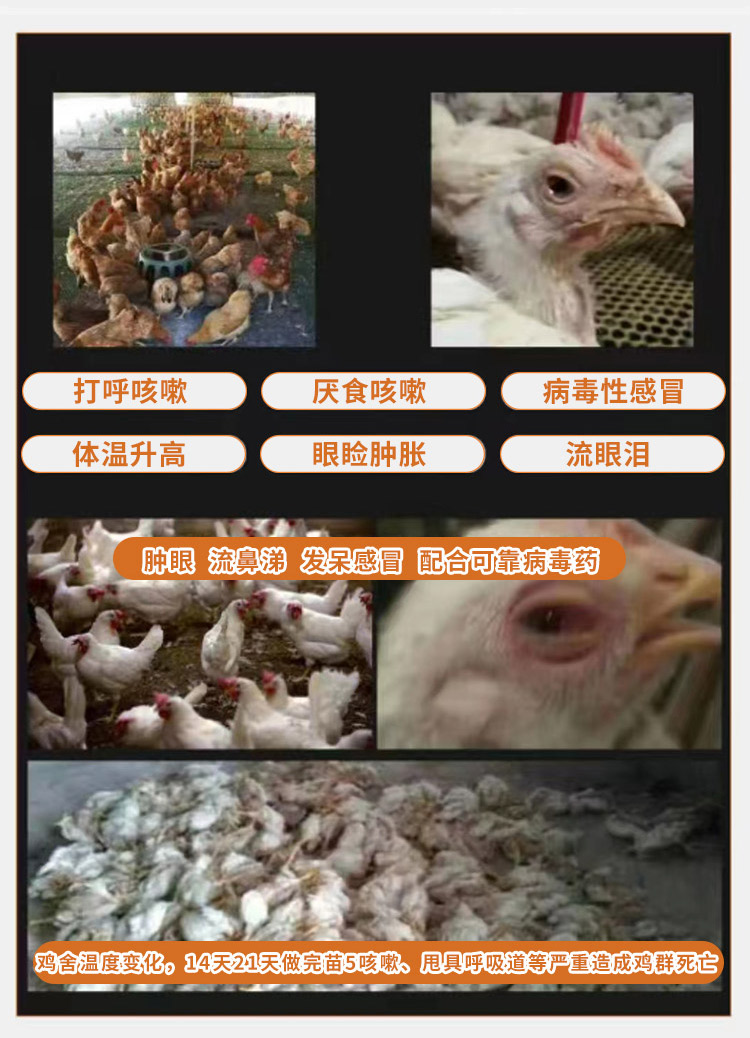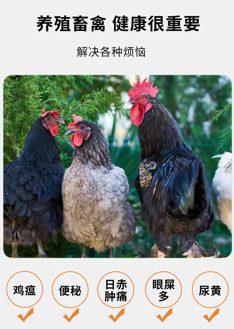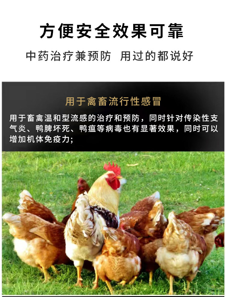 雞瘟、便秘、眼屎多、尿黃、流鼻涕、發呆感冒等,用于禽瘟和流感的治療與預防,同時針對傳染性支氣炎、鴨脾壞死、鴨瘟等病毒也有顯著效果,同時可以增強機體免疫力。