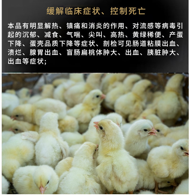 雞瘟、便秘、眼屎多、尿黃、流鼻涕、發呆感冒等,用于禽瘟和流感的治療與預防,同時針對傳染性支氣炎、鴨脾壞死、鴨瘟等病毒也有顯著效果,同時可以增強機體免疫力。" />