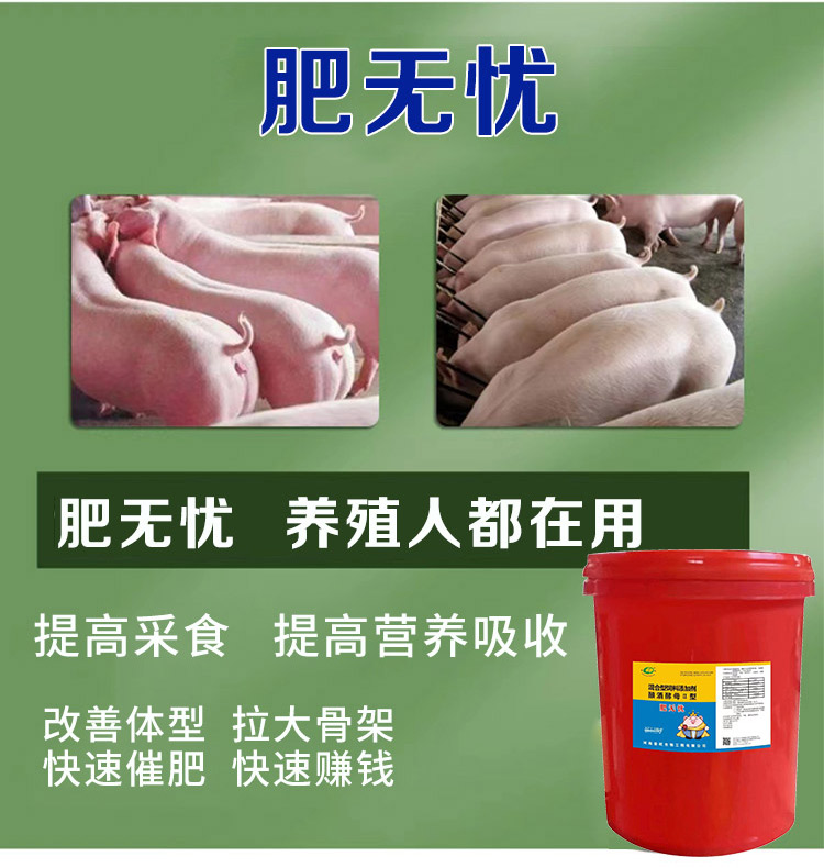 產品簡介:普旺新版GMP獸藥廠家肥無憂長肉快早出欄,益生菌促進營養吸收,快速增肥,縮短出欄日期,減少因環境產生的應激反應,提高肉質量和屠宰率,一頭豬可節省80-90斤飼料,改善體型、拉大骨架、快速催肥、快速賺錢。